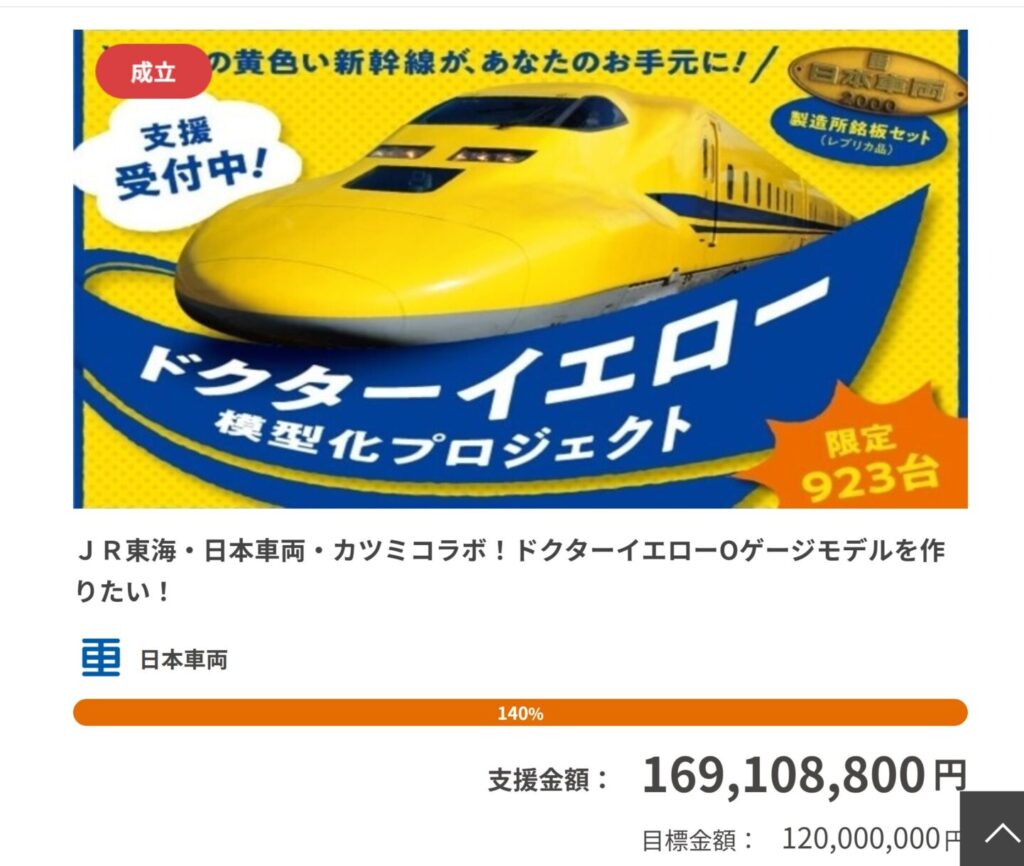 このプロジェクトの横には「JR東海・日本車両・カツミコラボ!ドクターイエローOゲージモデルを作りたい!」の目標金額120,000,000円→支援金額結果:169,108,800円集まった化け物プロジェクトがあって何度見ても驚きます。😂